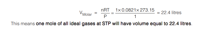 We know from our earlier discussion that Standard Pressure for ideal gases is taken to be 1 atm and Standard Temperature is taken to be 273.15 K or 0°C. Under these conditions the volume of one mole of a ideal gas also called Molar Volume will be calculated as